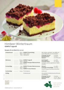 Der Himbeer-Wintertraum aus KOMPLET Jogosoft vereint winterliche Raffinesse mit fruchtiger Leichtigkeit: Eine lockere Joghurt-Sandmasse auf zarten Kakaostreuseln bildet die Basis für eine feine Persipan-Cremeauflage, gekrönt von fruchtigen Himbeeren. Das harmonische Spiel aus nussiger Note, frischer Frucht und schokoladigem Crunch macht diesen Kuchen zur idealen Wahl für die Wintersaison – ein Genuss, der begeistert!